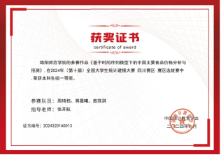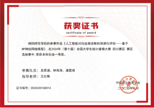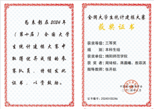 近日,2024年(第十届)全国大学生统计建模大赛公布获奖名单,绵阳师范学院10支队伍获奖,其中国赛获奖1支,省赛获奖9支。